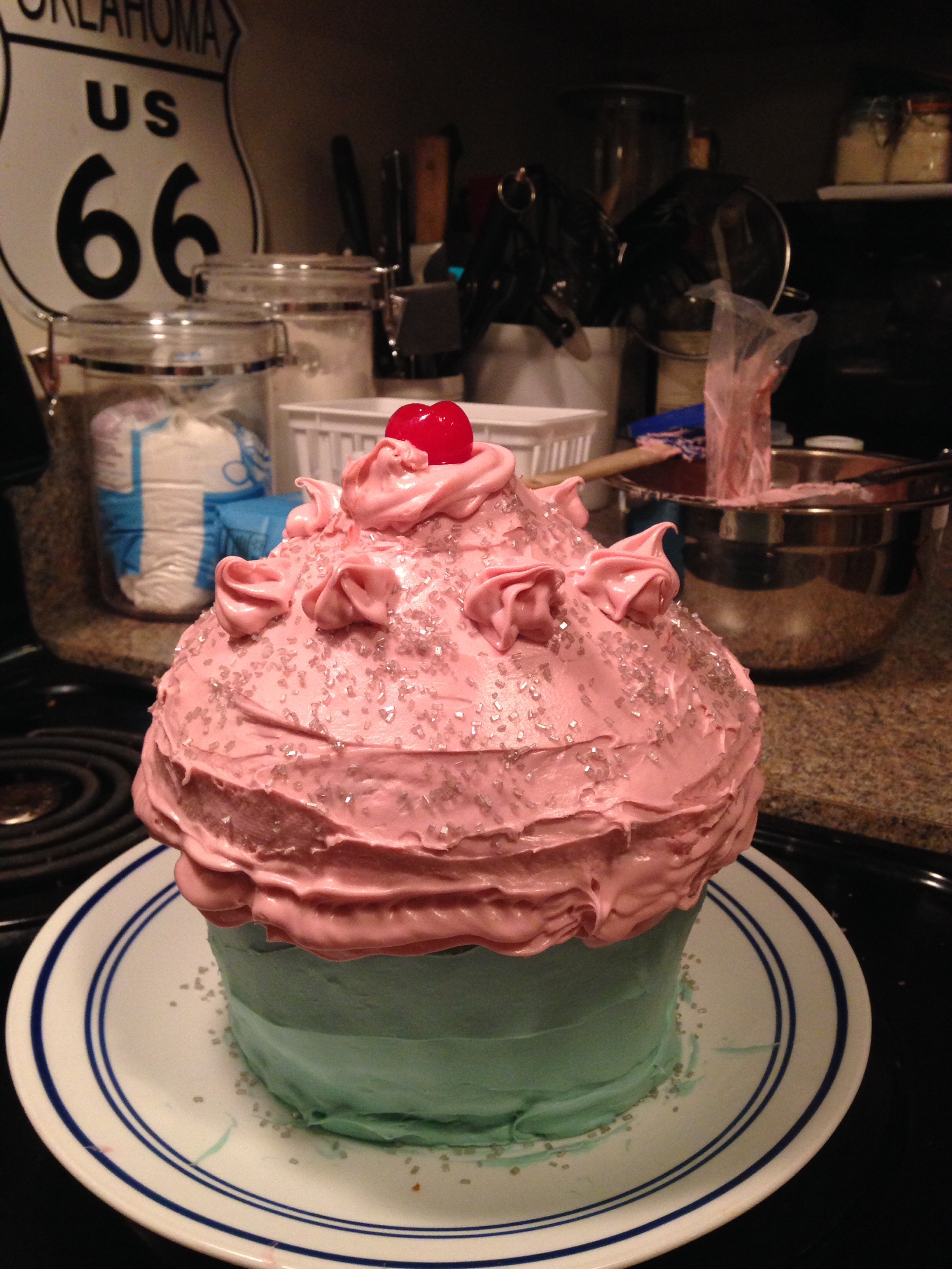 We are totally broke and saving our money for Christmas and it would be awkward to buy something. But I love to bake and cook. So I borrowed this giant cupcake pan from another neighbor and viola! Giant cupcake birthday cake.